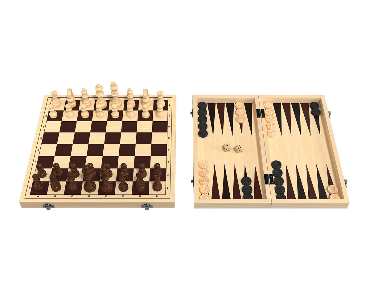 Cutia din lemn deschisa are 35 x 35 cm și servește drept tablă pentru ambele jocuri. Piesele de șah si pulurile jocului de table sunt realizate din lemn.