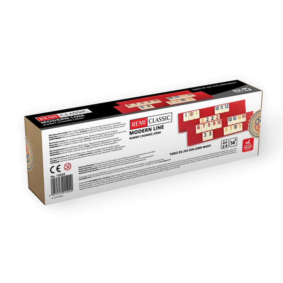 Remi MODERN LINE este un joc de remi clasic de calitate superioară, cu table din lemn masiv, de esență tare, vopsite în roșu și piese de joc realizate din materiale compozit pe bază de melamină sau ABS (material plastic de înaltă calitate). Această ediție este prezentat într-un ambalaj elegant compact.